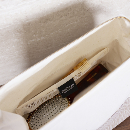 La trousse de toilette ALBA a été pensée comme un objet à la fois fonctionnel et esthétique, fidèle à l’ADN BathBazaar. Son design sobre met en valeur la matière, tandis que chaque détail a été étudié pour offrir un usage fluide et durable.