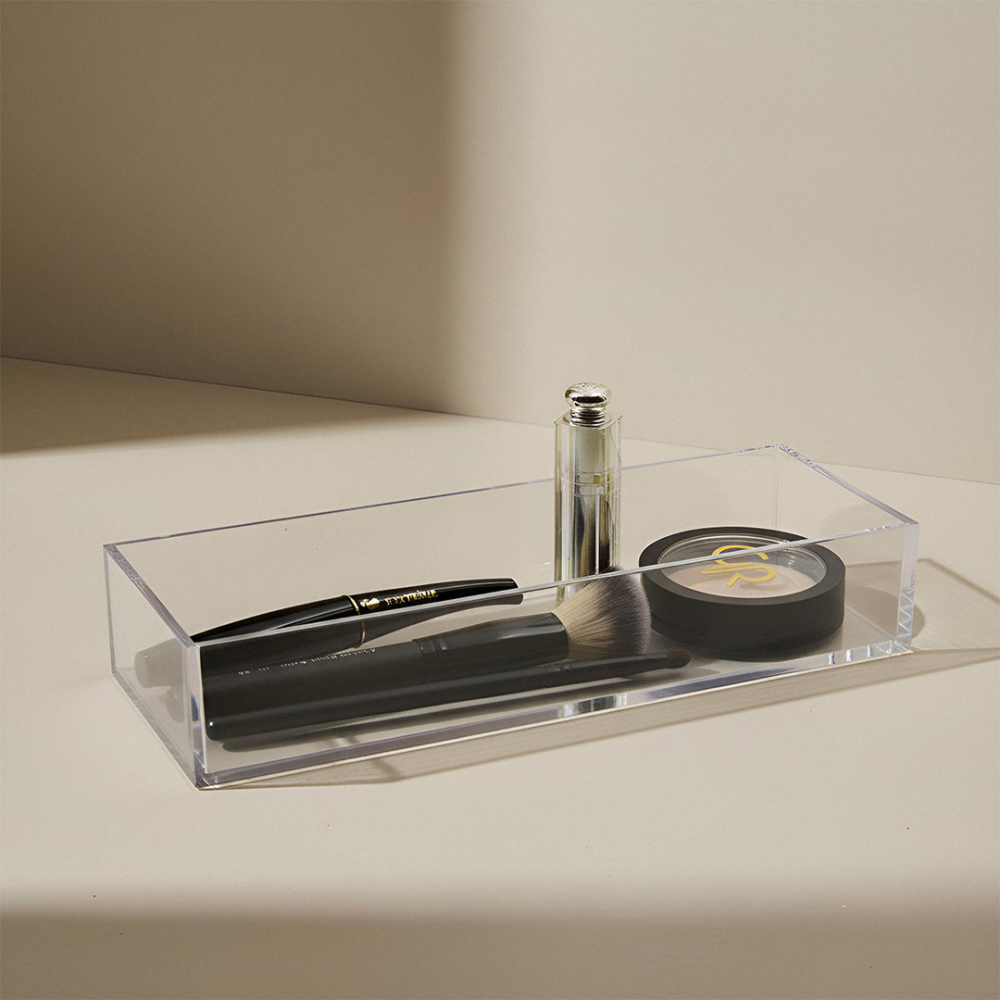 Casier empilable rectangulaire en acrylique transparent haut de gamme.
