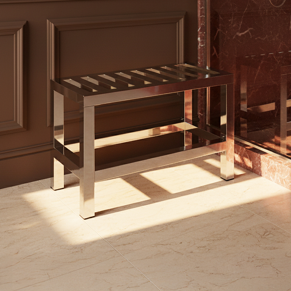 Banc tout en inox, il est conçu pour les pièces humides et peut même se placer dans la douche.